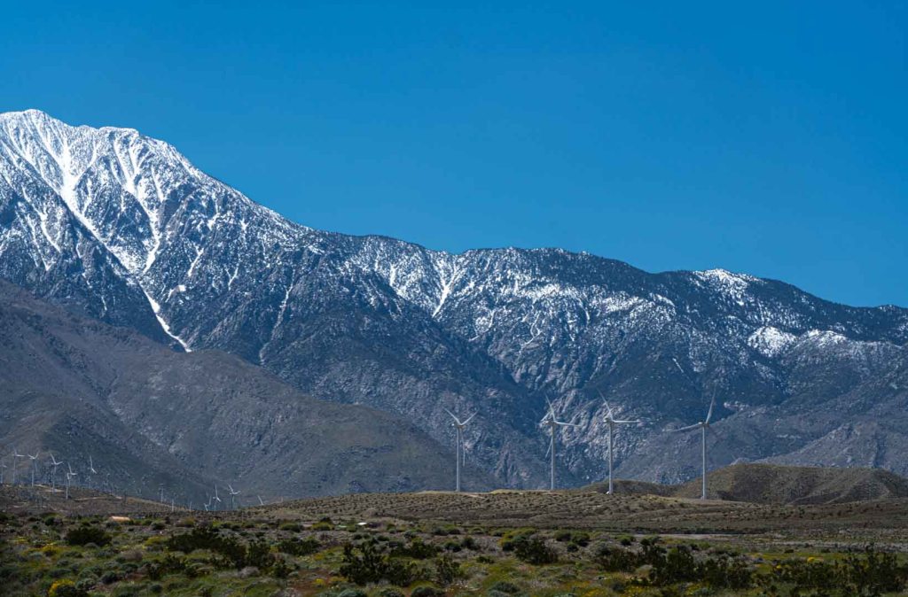 We are now heading on a road that is taking us through two mountains. Desert and snow all at once. We are still in California heading toward Arizona, the countryside now looks like a moonscape. Here we are driving through the desert and a road sign says that the road is subject to flooding!