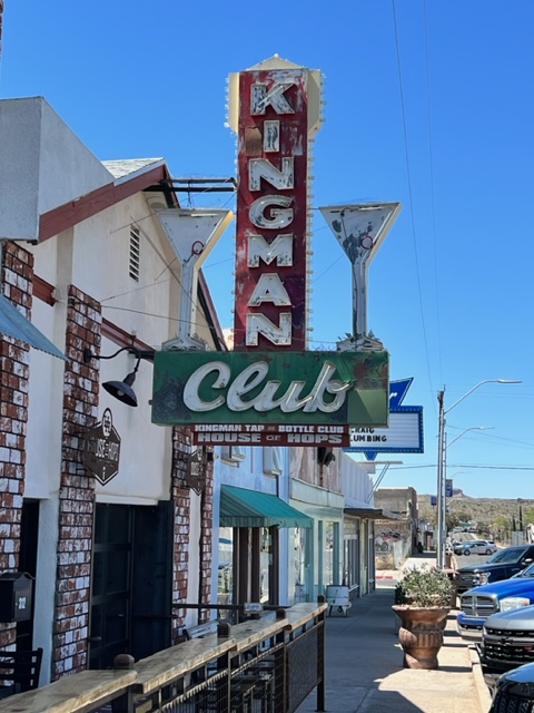 In Kingman we stopped for lunch at The Kingman club, it’s it’s a pretty new brew pub and it brews Grand Canyon beers, quite a few of them, but none of us are really interested in drinking, nice ambiance. We don’t pass up trying the Fried Pickles – a dead set winner, then various meals between us – I chose the smallest thing I could see, the appetiser ribs and I was pretty chockablock afterwards – the place is definitely just starting out, still ironing out the wrinkles.