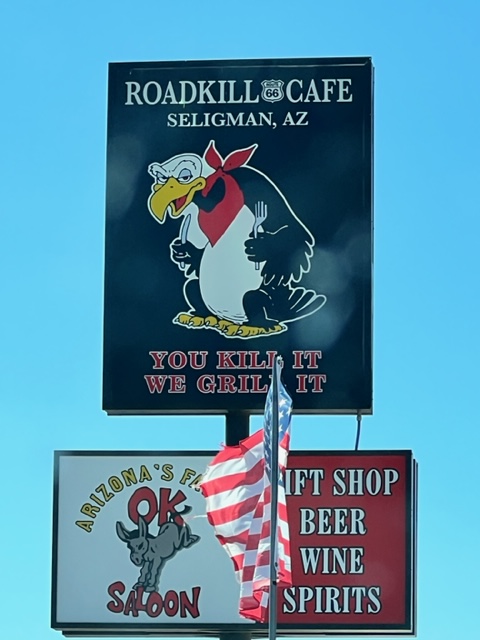 In Seligman we stop to check out the Road Kill Café, Rob buy’s the T-Shirt, I ogle the cakes, but Peachtree is still a raw memory for anything cake.