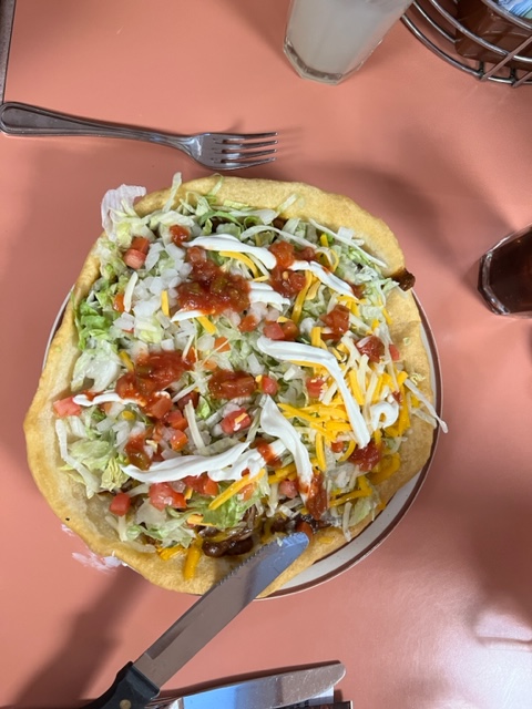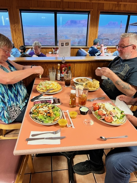 We take the local dining room at Goulding’s Lodge ……. Surprise, surprise, surprise it beats our expectations again. No alcohol on the Indian Reservation, a good opportunity to have a break. I go the sticky salad and for once it’s a small manageable meal washed down with root beer. Wendy’s takes the cake again, she goes the single taco ……. It’s a taco pizza!