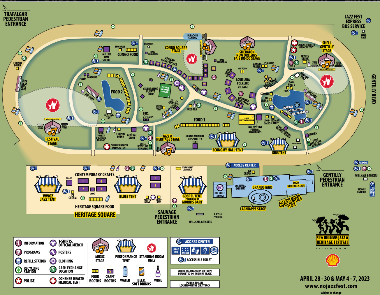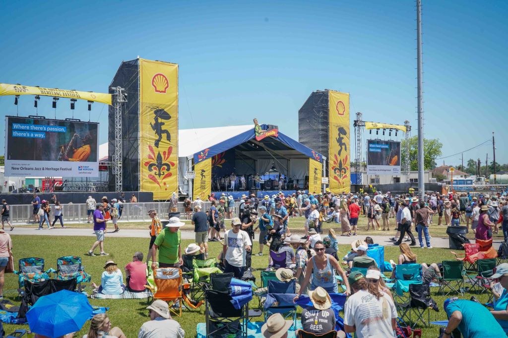 We head over to the Gentilly Stage as I thought the Honey Island Swamp Band would be playing. Jazz Fest looks after people who have mobility problems. There is a booth where you can get a wristband that allows you to sit in specially designated areas. Wendy was also able to get a wristband as “my carer”! We met a guy in the stand who picked my accent straight away. He proceeded to roll off the names of Australian bands that he loved, Men at Work, Little River Band, Crowded House, and Midnight Oil. He was astounded when I told him I knew Rob Hirst. The band playing is The Naughty Professor. A little too “jazzy” for me.