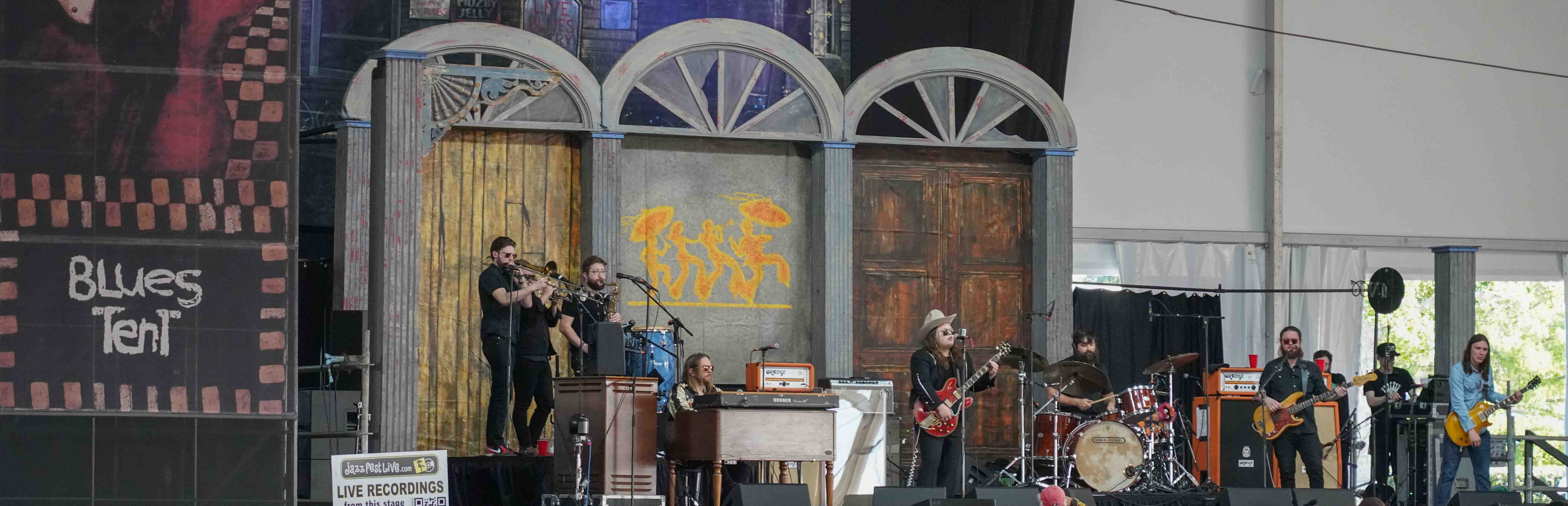 We move to the Blues Tent for Davell Crawford with special guest Benny Turner. Not sure what is happening this year with this stage as they are having a lot of technical issues. Davell is the Grandson of the late New Orleans R&B great James ‘Sugarboy’ Crawford. Benny Turner is an 83-year-old bassist/singer and is the brother of Freddie King. Benny was also the band leader for the legendary Marva Wright. Davell is a great entertainer, singer, and keyboard player. Flamboyantly dressed, he overcomes the technical difficulties and leads his terrific band of New Orleans musicians through a killer set. Benny comes on stage mid-set and sings a couple of songs including the Howlin’ Wolf version of ‘Goin Down Slow’. He told the back story of being a six-year-old and seeing ‘the Wolf’ perform this song. He said, ‘I never knew the meaning of the song until I read Howlin’ Wolf’s biography’. This song has always been a favorite of mine.