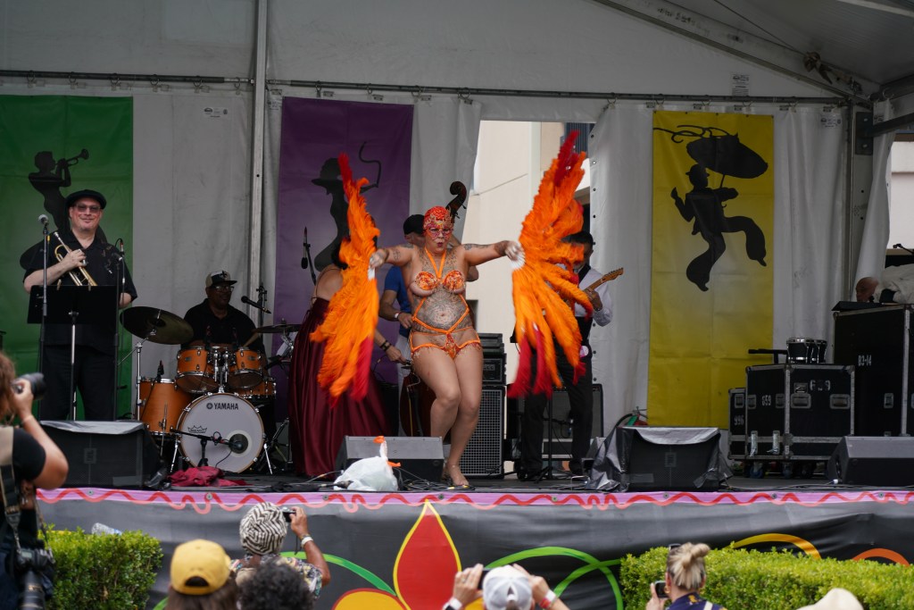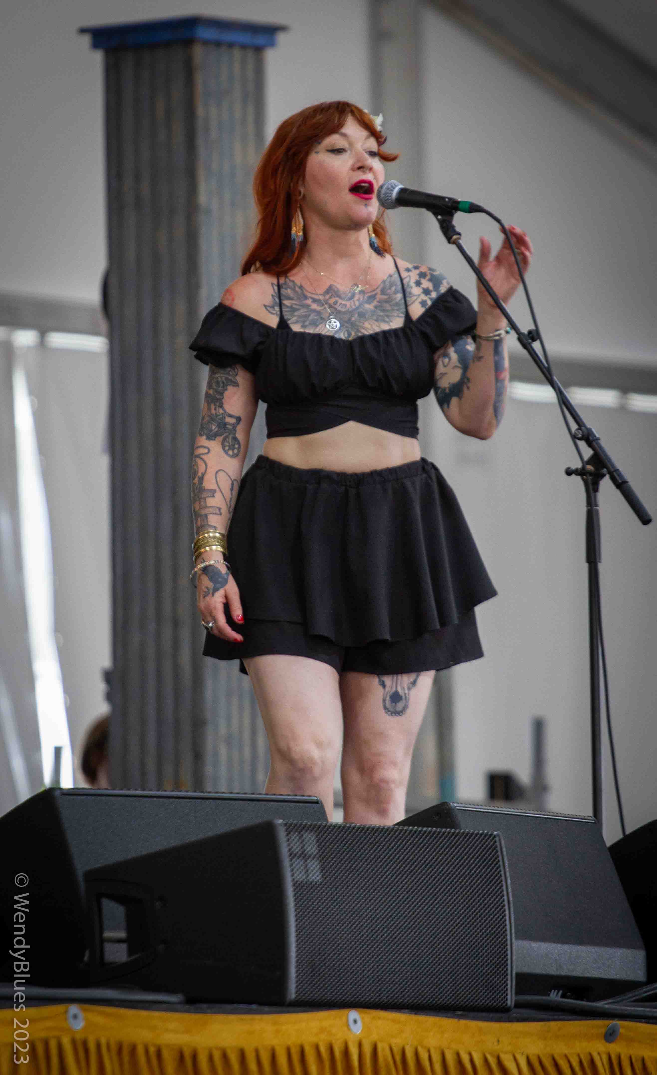 We were at the Fest at 11:30. Word is on the street that the crowd will be down due to the forecast of dodgy weather and no big-name acts. I started off at the Lagniappe Stage for Ingrid Lucia. Ingrid could be described as a Cabaret-type singer. What was eye-opening is she had the most outrageous and scantily clad fan dancer on stage. Of course, I was there for the music.