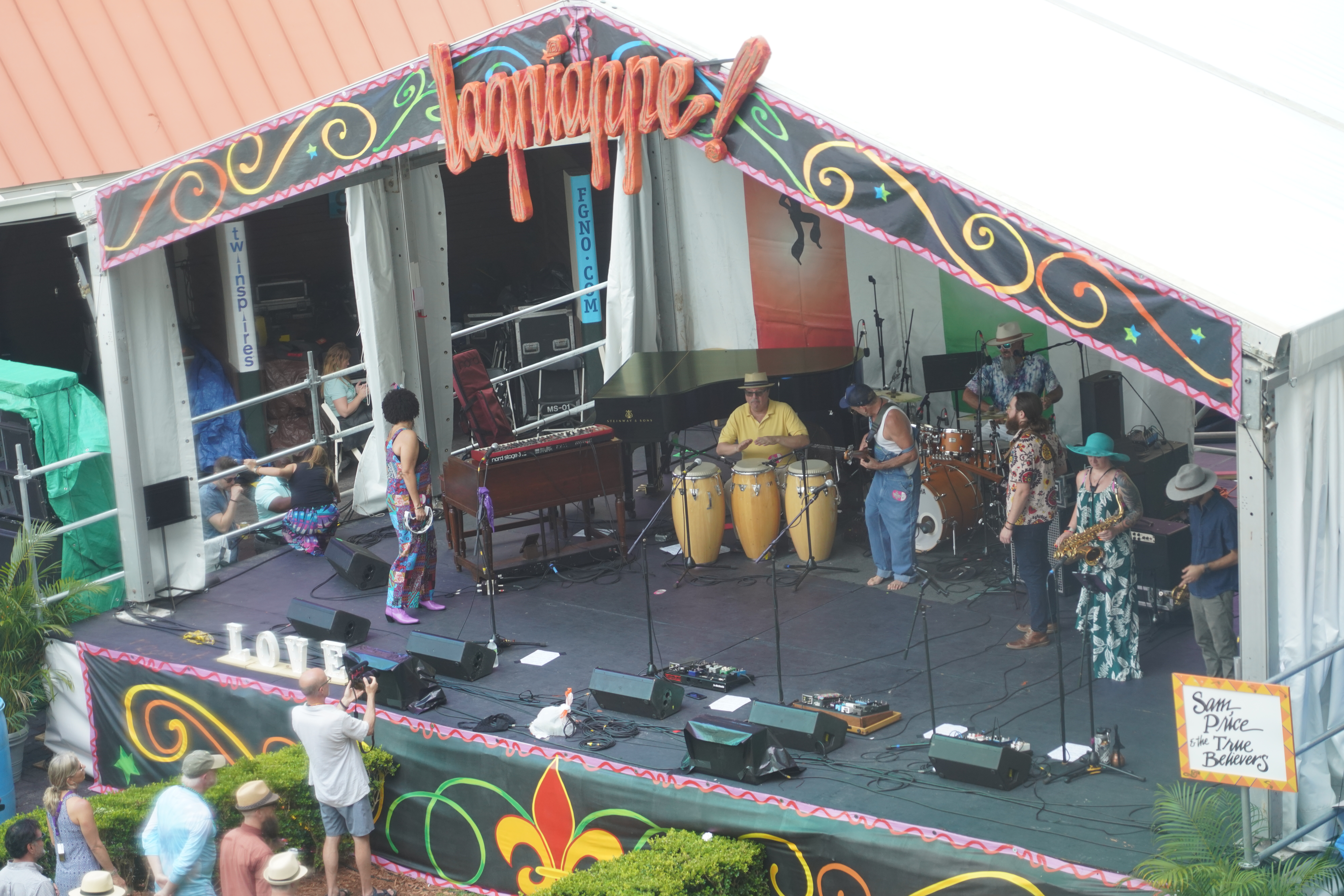 Back to the Lagniappe Stage for another favorite band, the Deslondes. I spotted Bernie and we listened to the set.